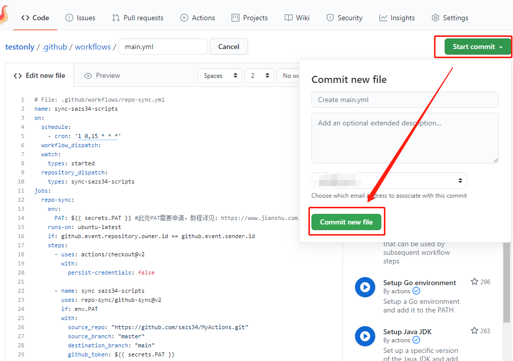 复制完毕后直接点击右上角的Start commit后直接Commit new file即可