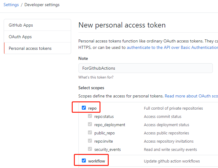 点击 GitHub 用户设置页面 最下方的Developer setting ,然后选择 Personal access tokens(点击快捷到达指定页面) 来生成一个 token,把 repo和workflow 两部分勾上即可。