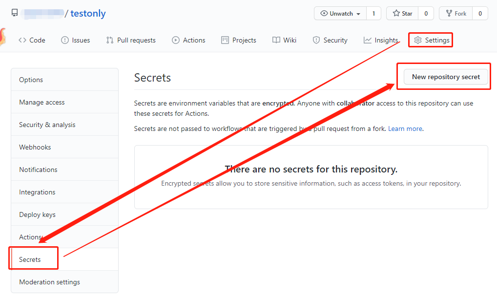 申请完毕后,在分支中点击Settings-Secrets-New secret