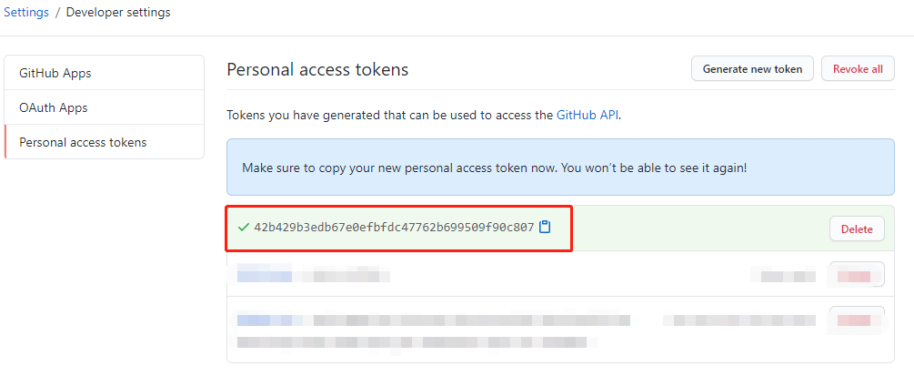 点击最下面的创建按钮后,图示部分即为你的PAT(图示的已经删除了,仅为演示),复制下来马上就要使用了