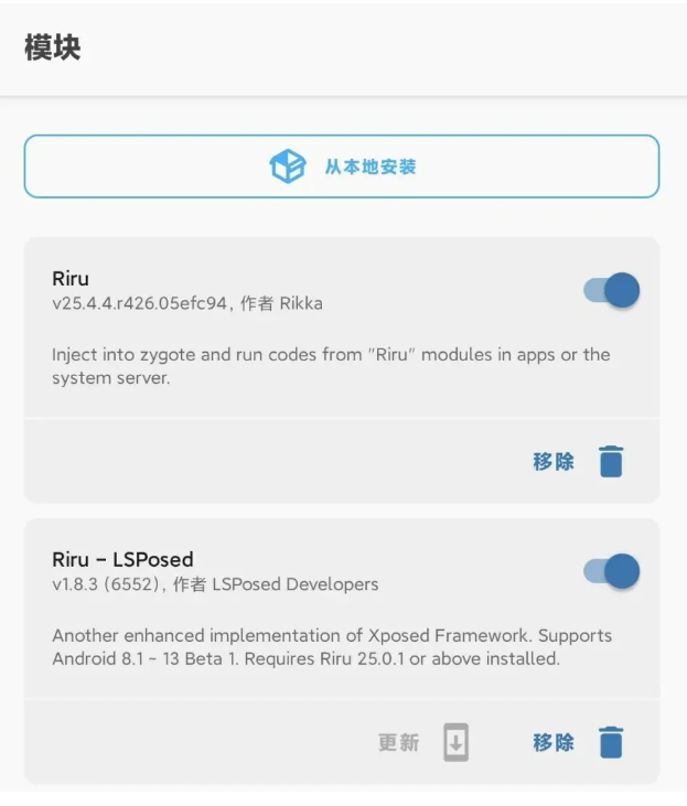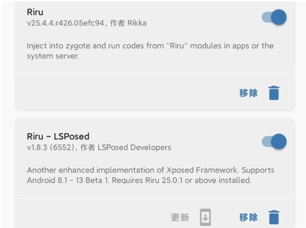 LSPosed的Riru版本需配合Magisk和Riru方可正常激活使用