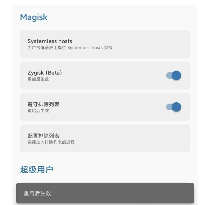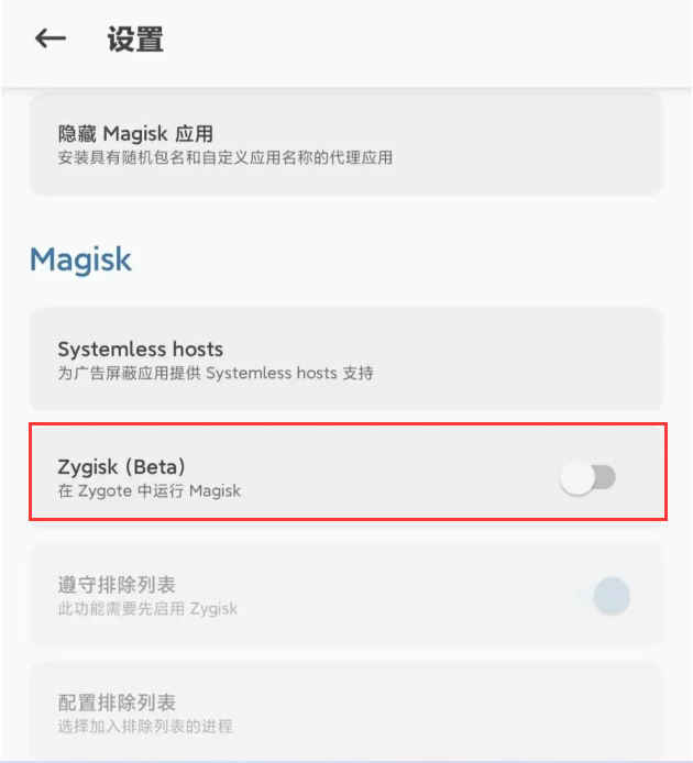 在面具Magisk设置中我们开启Zygisk并重启手机
